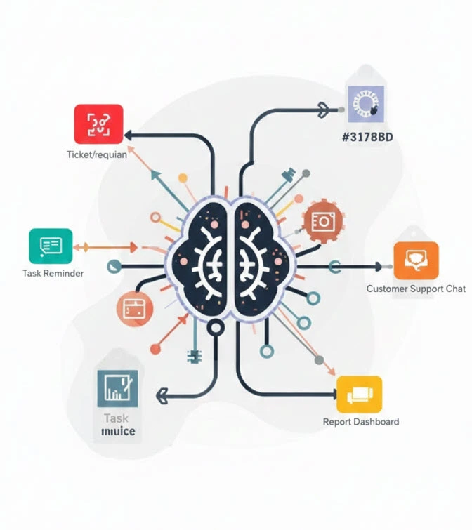 Phát triển các mô-đun AI giúp tự động hóa nghiệp vụ như: xử lý yêu cầu, tạo báo giá – hợp đồng – hóa đơn, nhắc việc, tổng hợp báo cáo, phân loại ticket, chăm sóc khách hàng… giảm thao tác thủ công và tăng tốc ra quyết định.