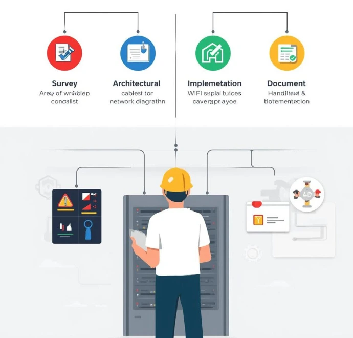 Doanh nghiệp thường “đau” ở chỗ mạng chập chờn, WiFi không đồng đều, hệ thống hay gián đoạn, mở rộng là rối, bảo mật thiếu lớp, và không có tài liệu bàn giao để vận hành.